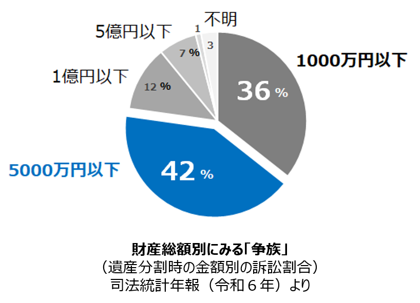 司法統計年報(令和6年)によりますと、財産総額別にみる「争族」(遺産分割時の金額別の訴訟割合)は下図の通り、5千万円以下が約80%占めています。相続財産が少ない場合でも「争族」になる可能性があります。